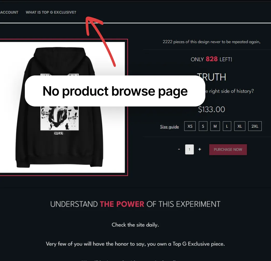 TopG.com was originally 1 page - the product page. There was no landing page or browse pages. There was also no place for products that Tate’s team wanted to sell in unlimited quantity.